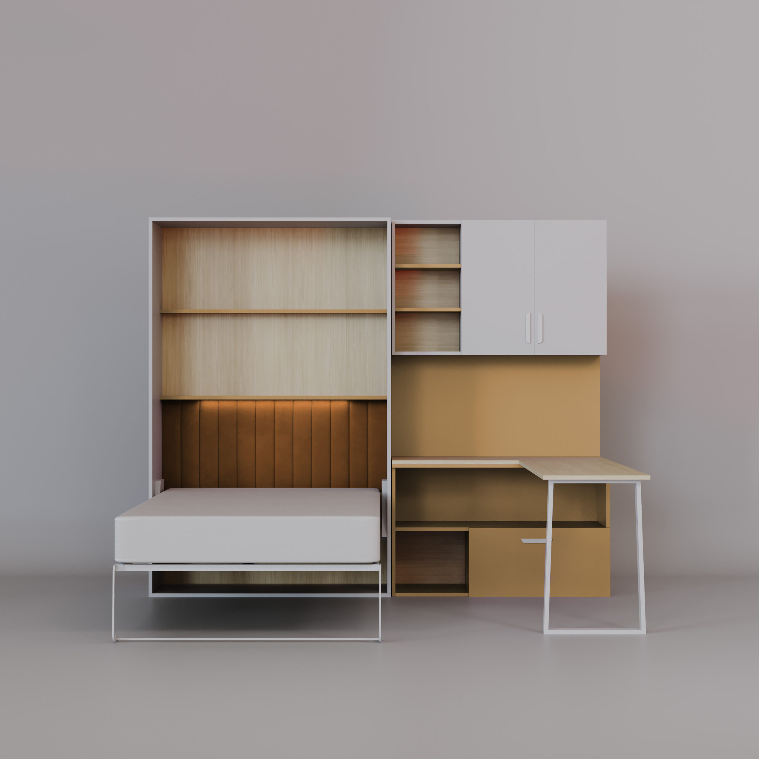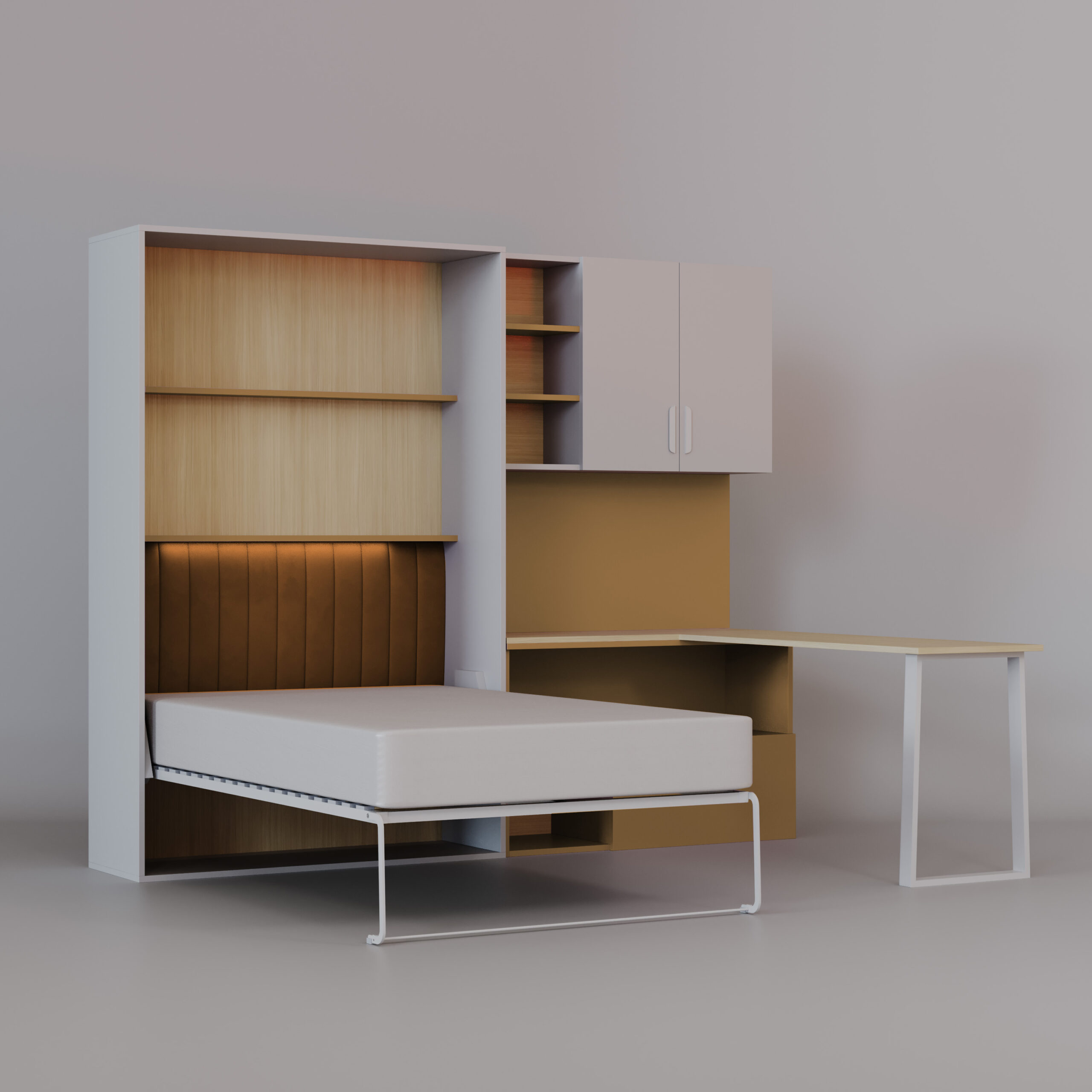 - Sistem Flexi Bed Lumi je moderna zložljiva postelja z integrirano pisalno mizo in knjižnimi policami – idealna rešitev za otroške ali študentske sobe.
