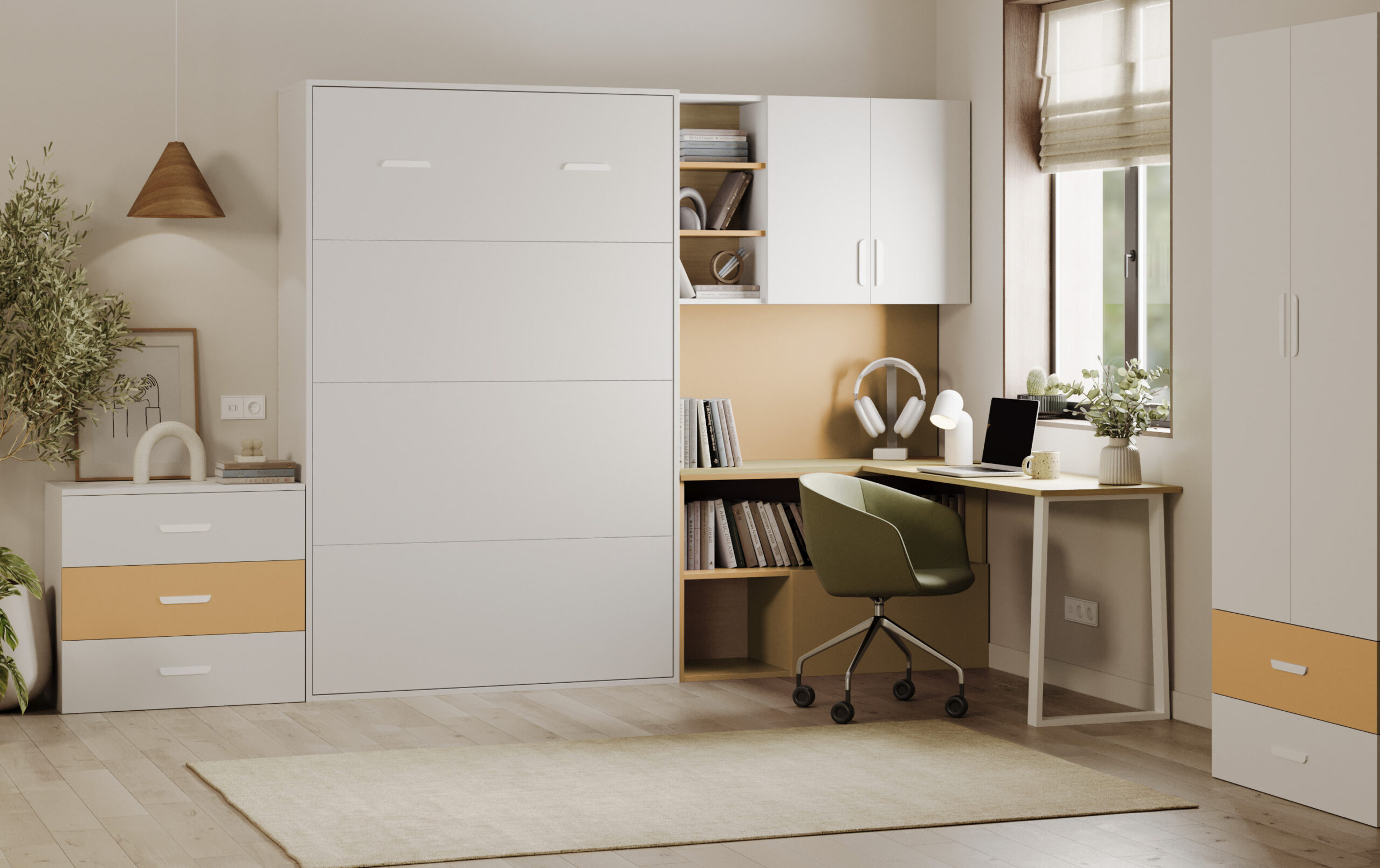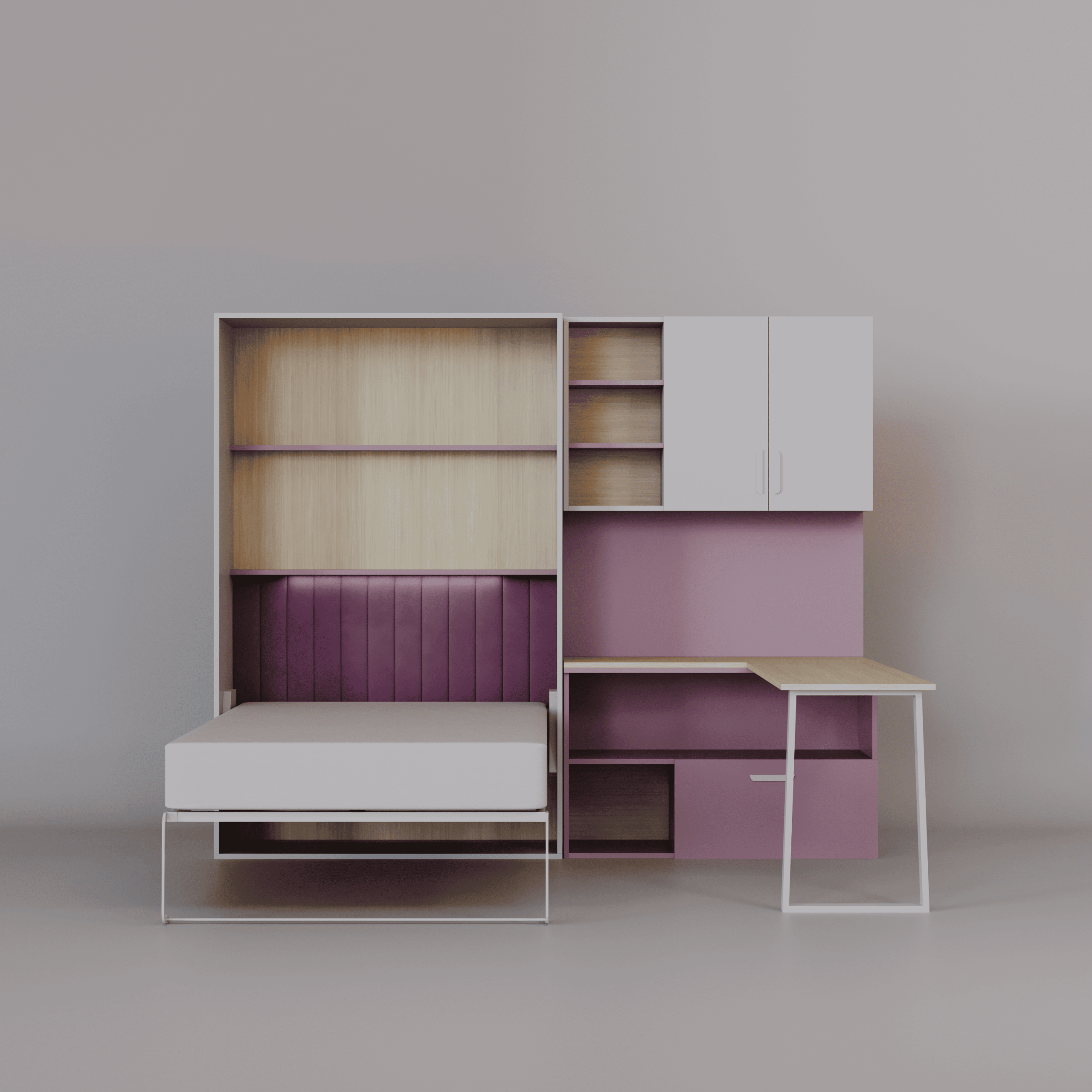 - Sistem Flexi Bed Lumi je moderna zložljiva postelja z integrirano pisalno mizo in knjižnimi policami – idealna rešitev za otroške ali študentske sobe.