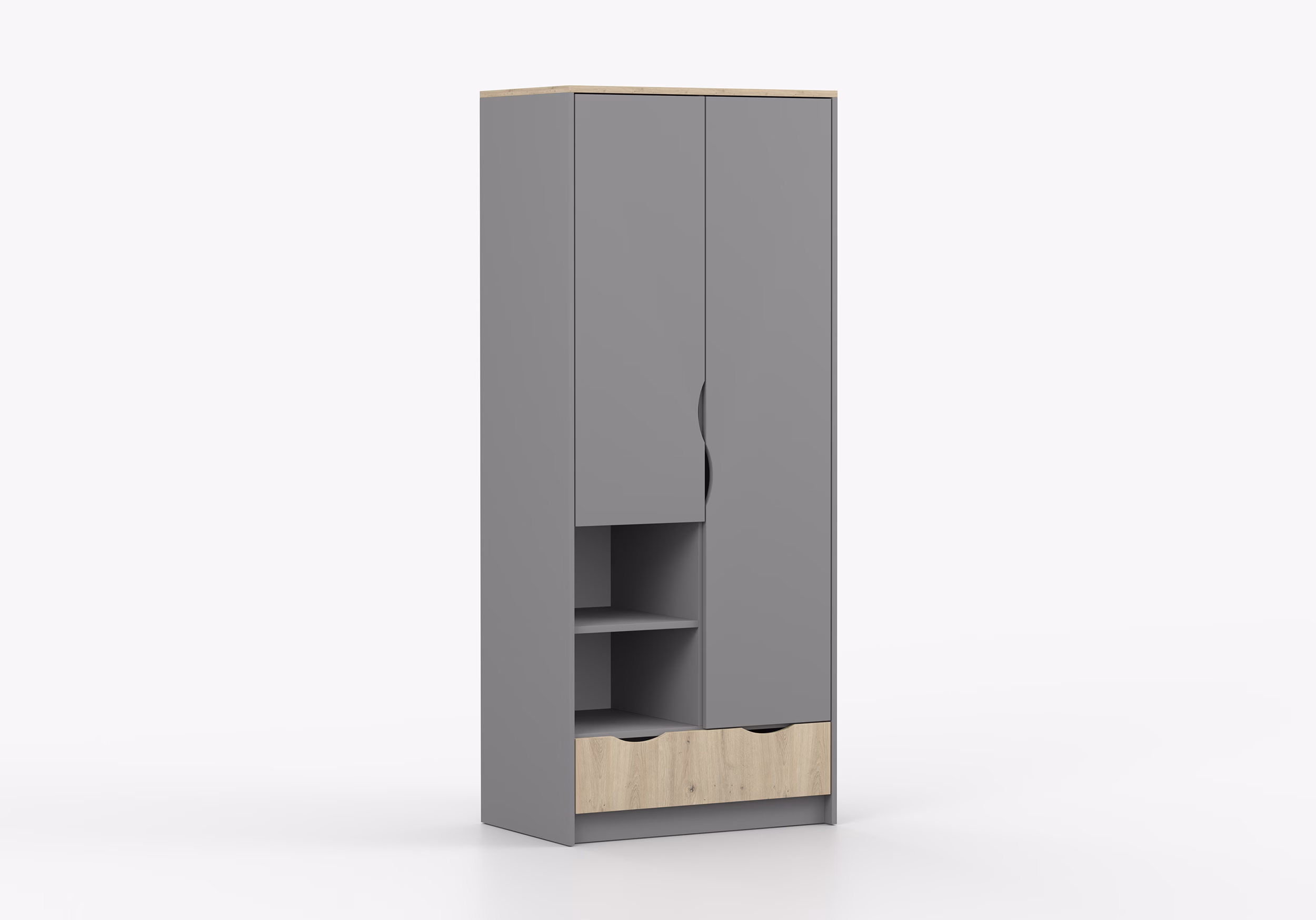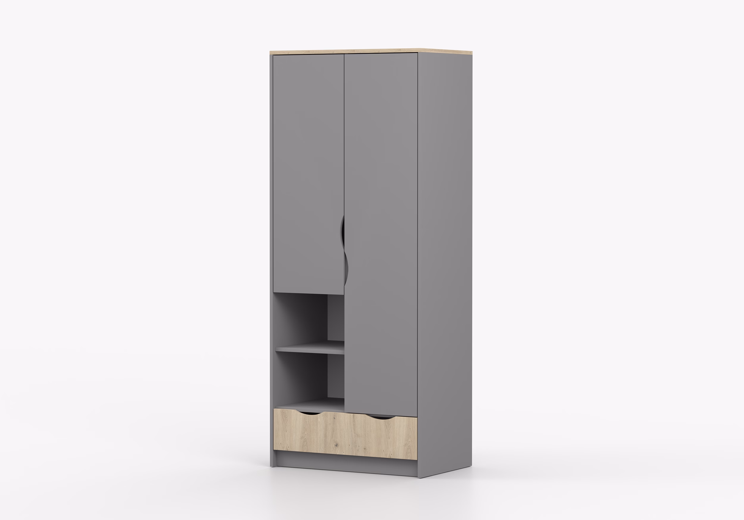 Dvokrilna omara ima obešalno letev in police, zaradi česar je prostorna in praktična.