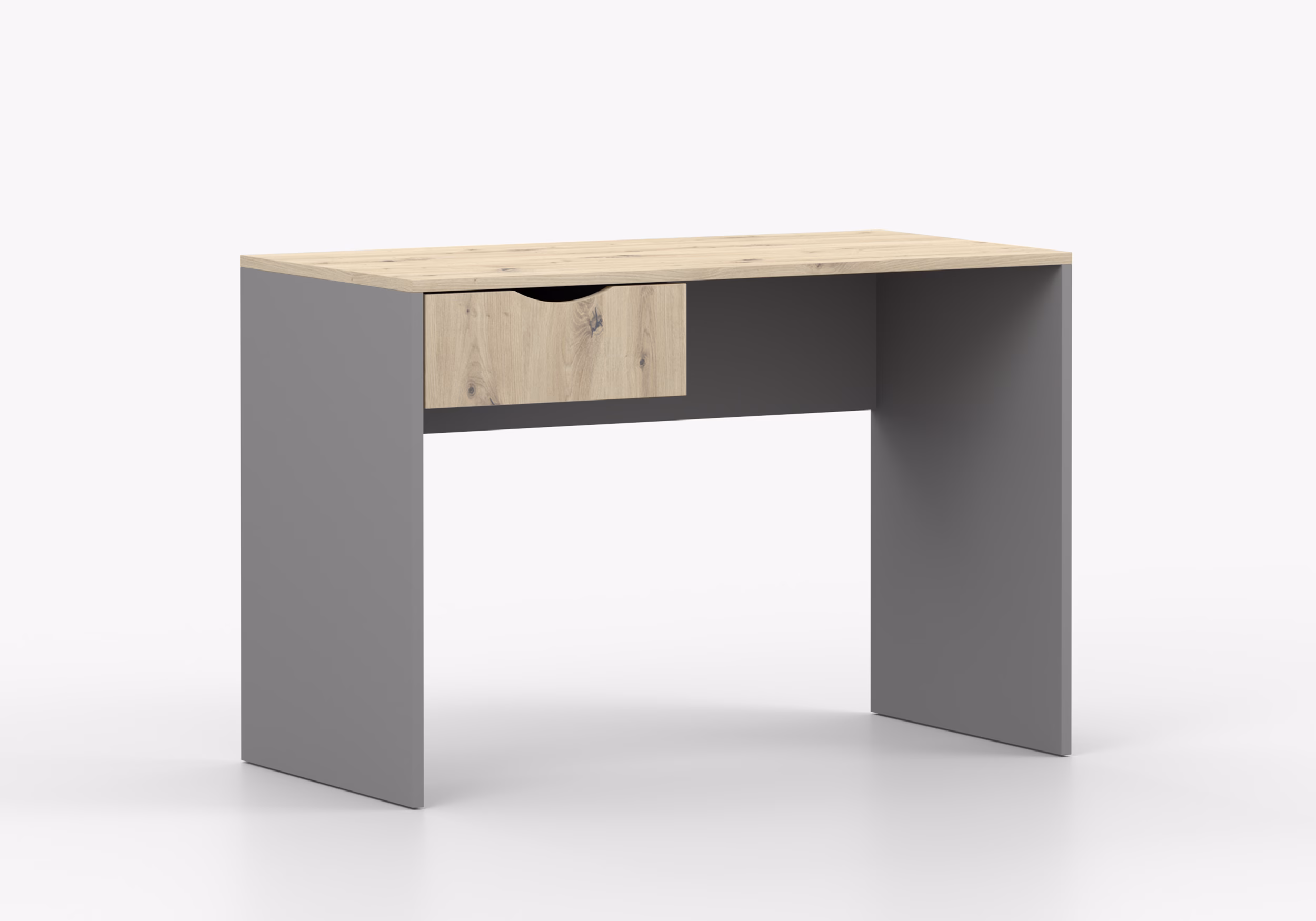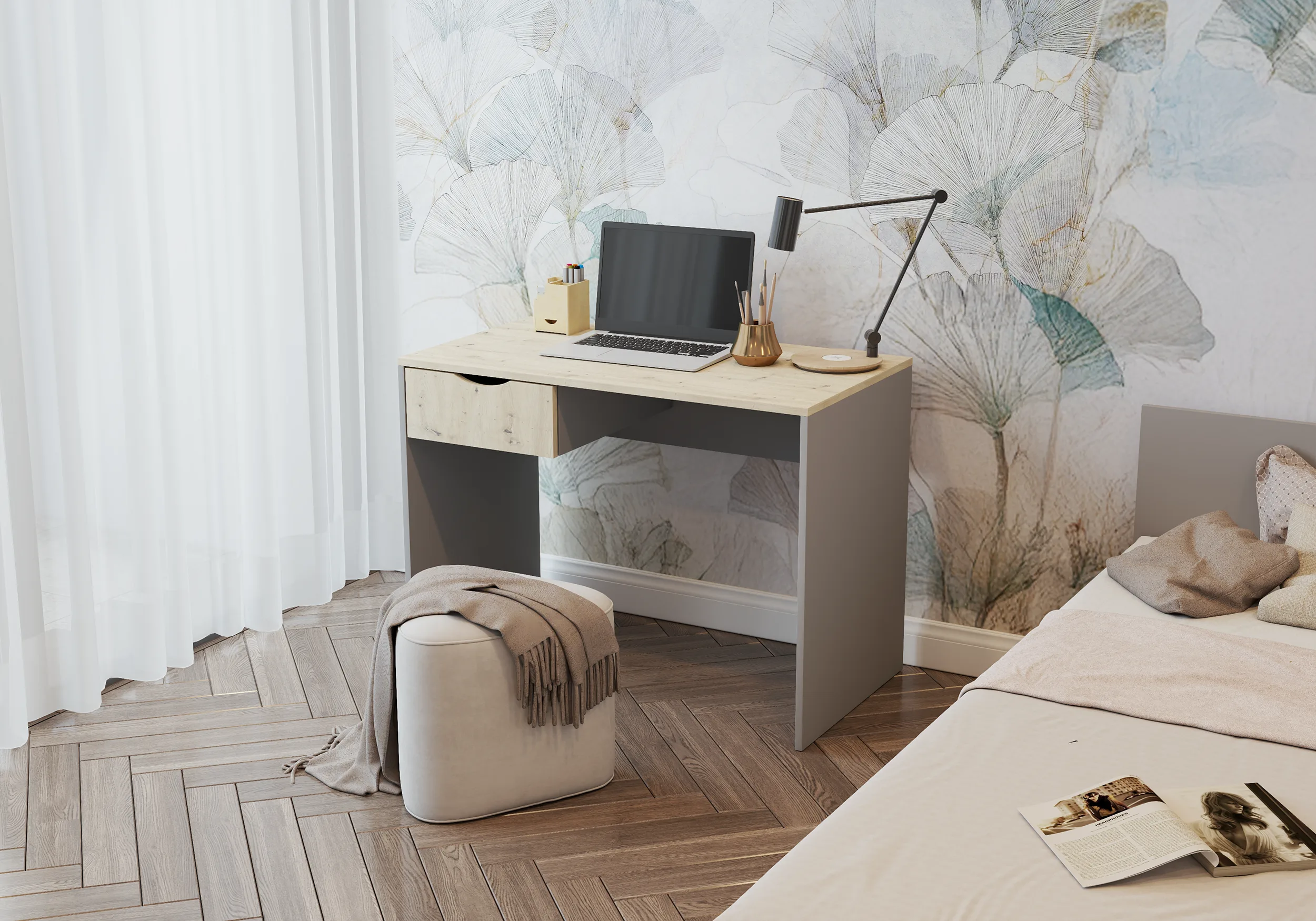 Pisalna miza je funkcionalna, s prostorno površino in predalom za dodatke.