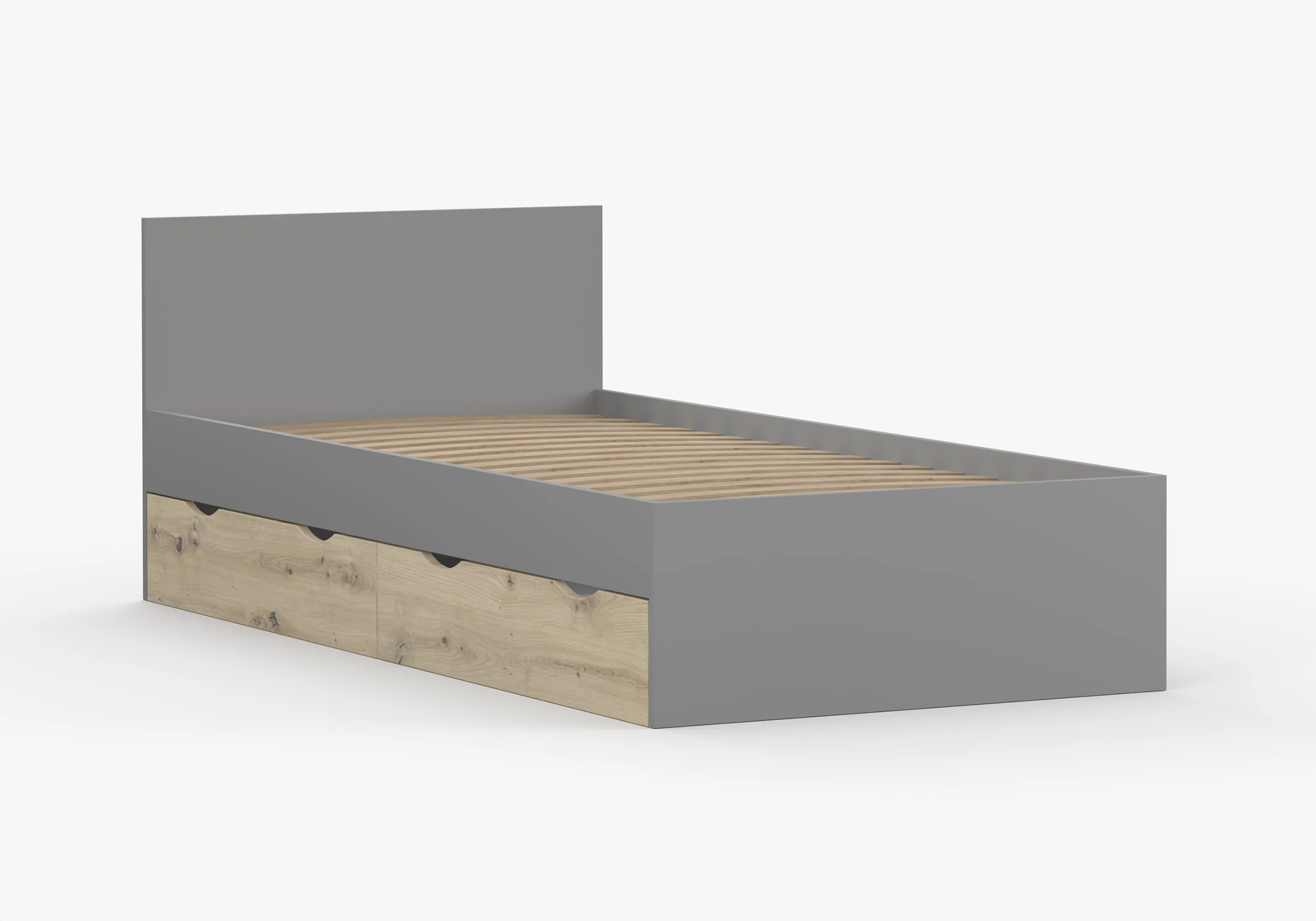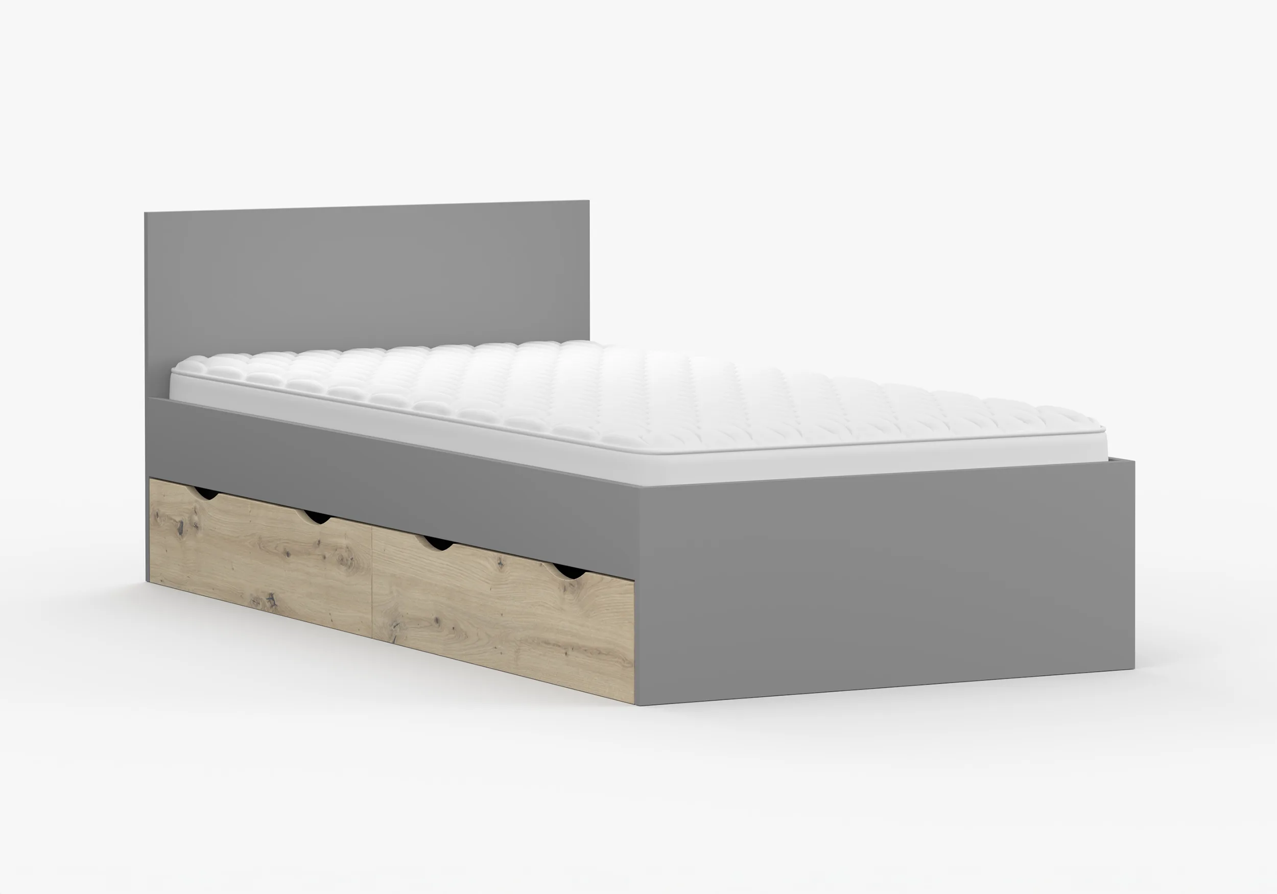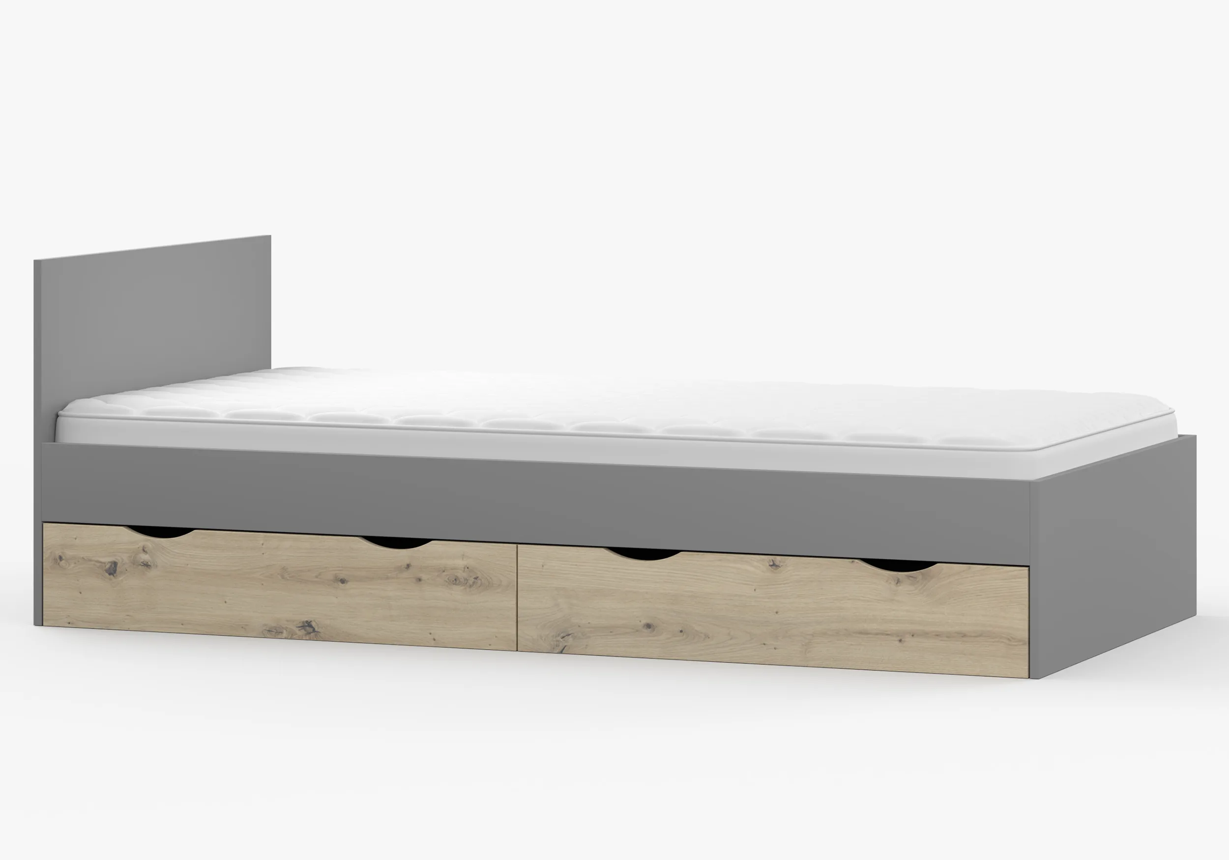 Postelja je opremljena s praktičnimi predali spodaj, kar omogoča učinkovito izrabo prostora pod posteljo.