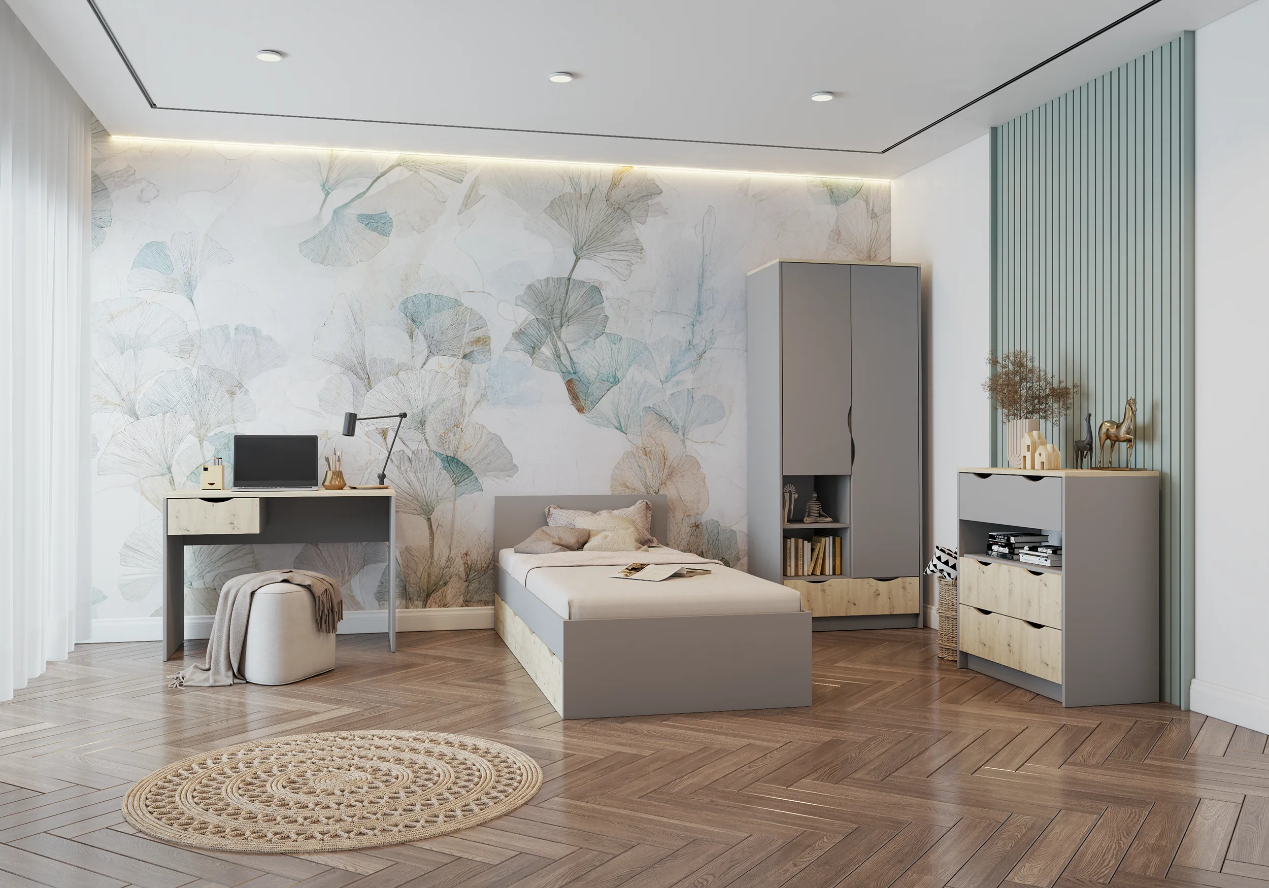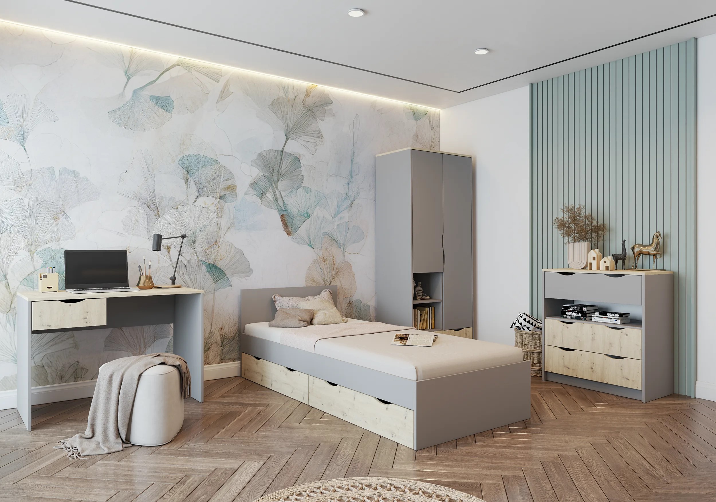 Soba postane udobna, praktična in funkcionalna, brezčasne barve pa komplet naredijo idealen tako za fantke kot za deklice.