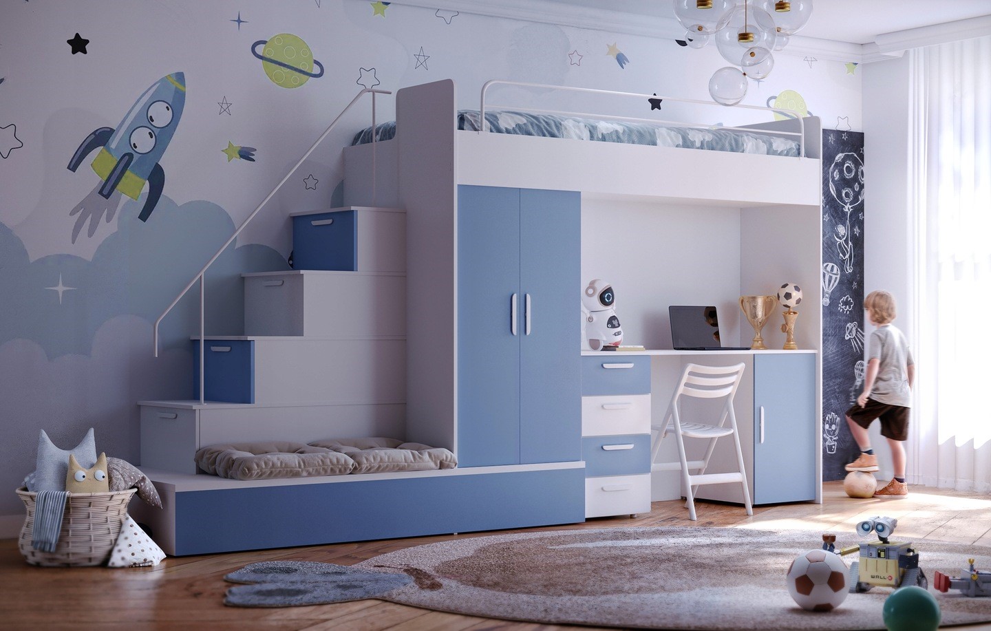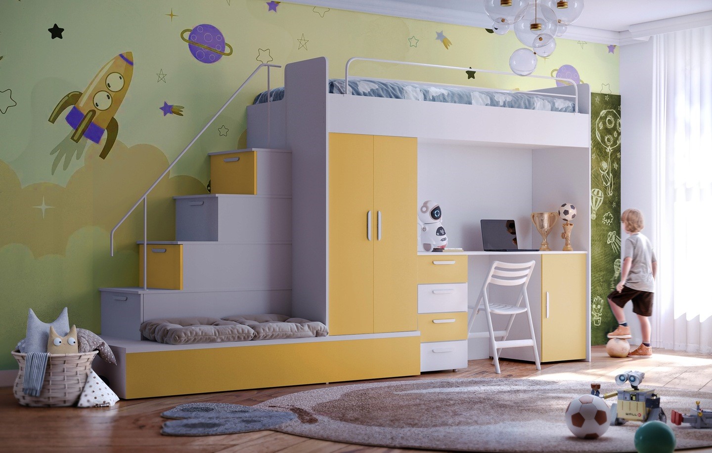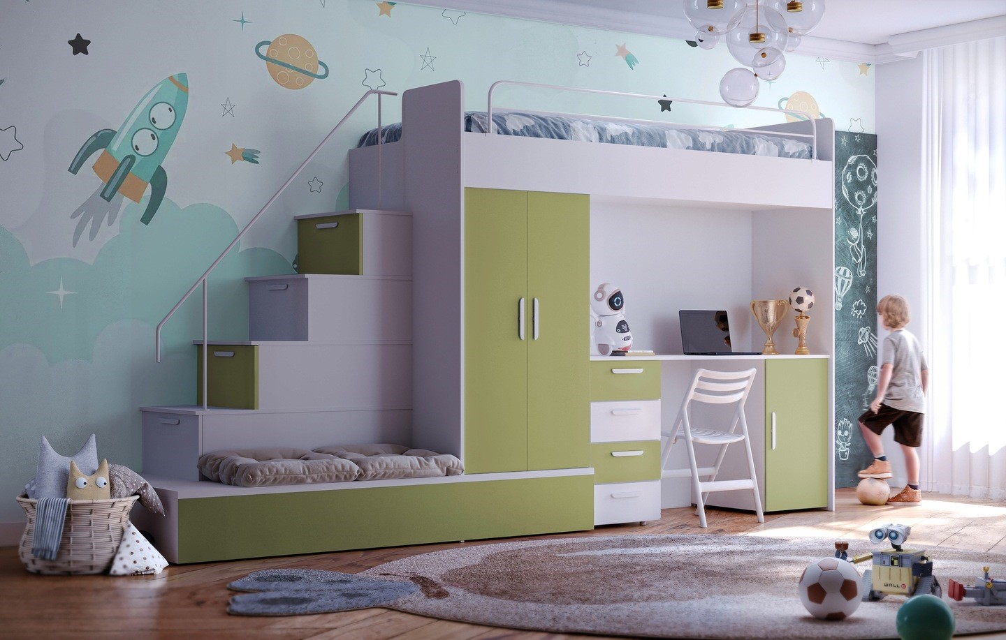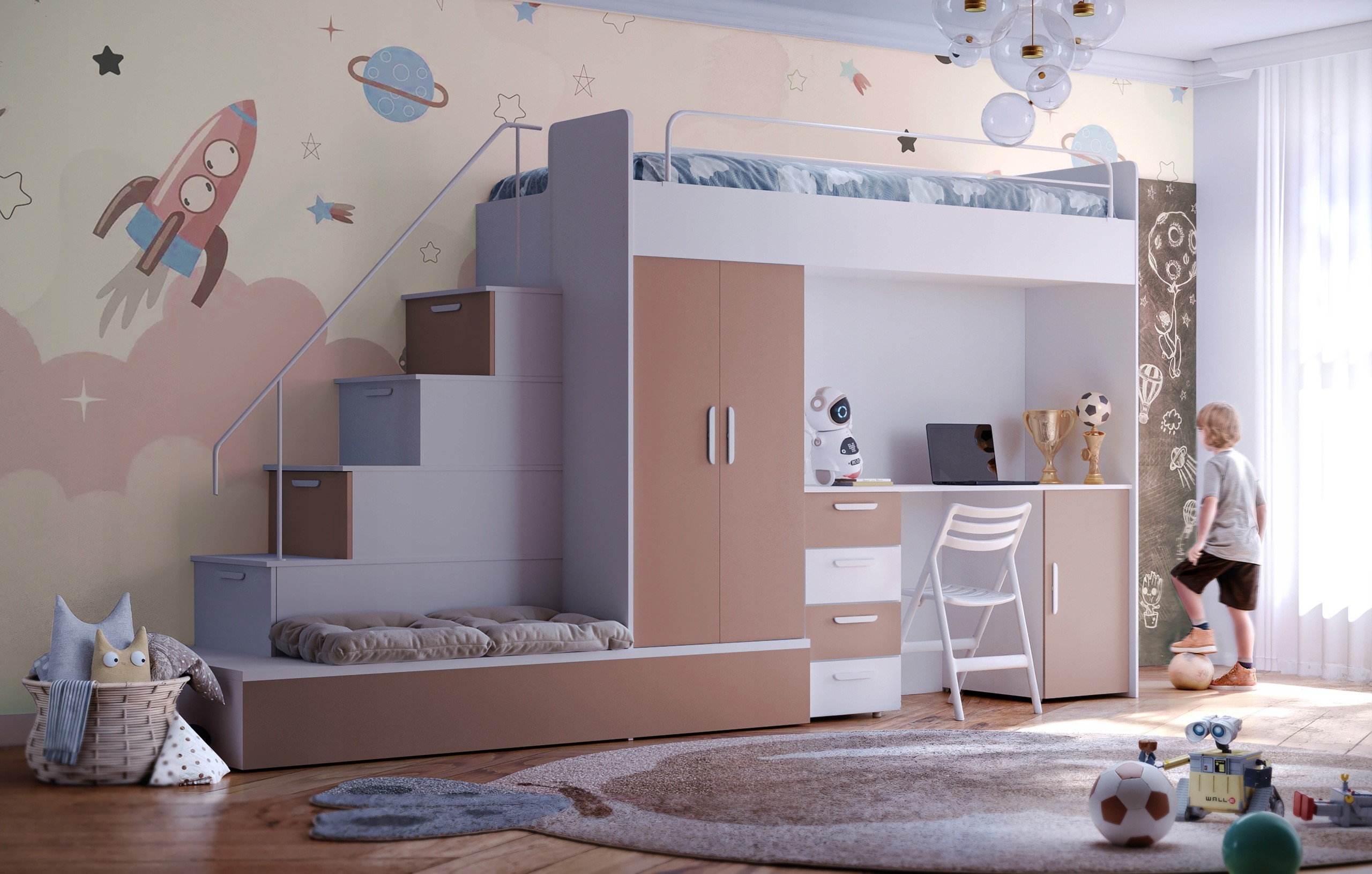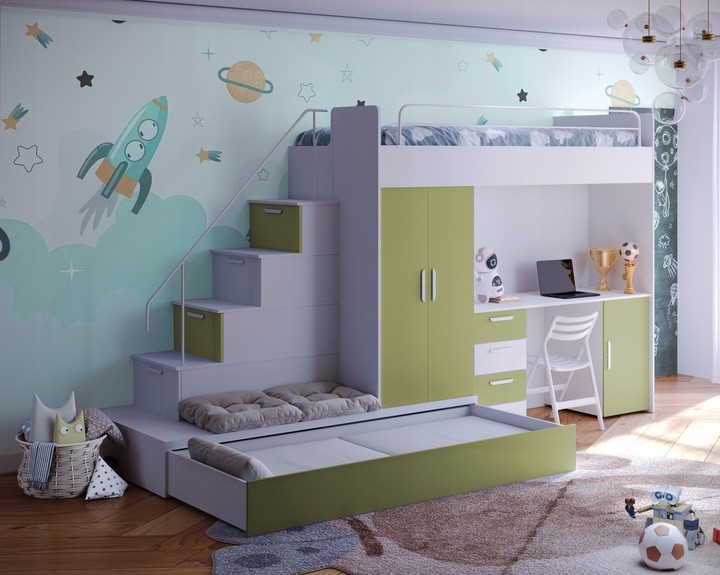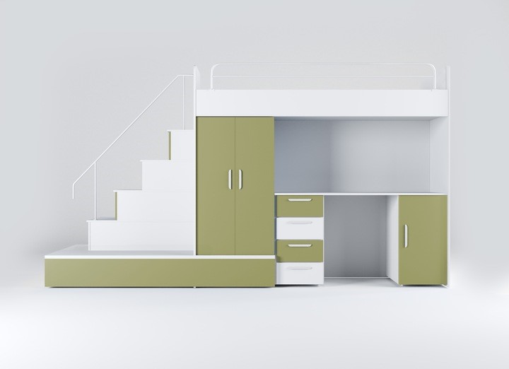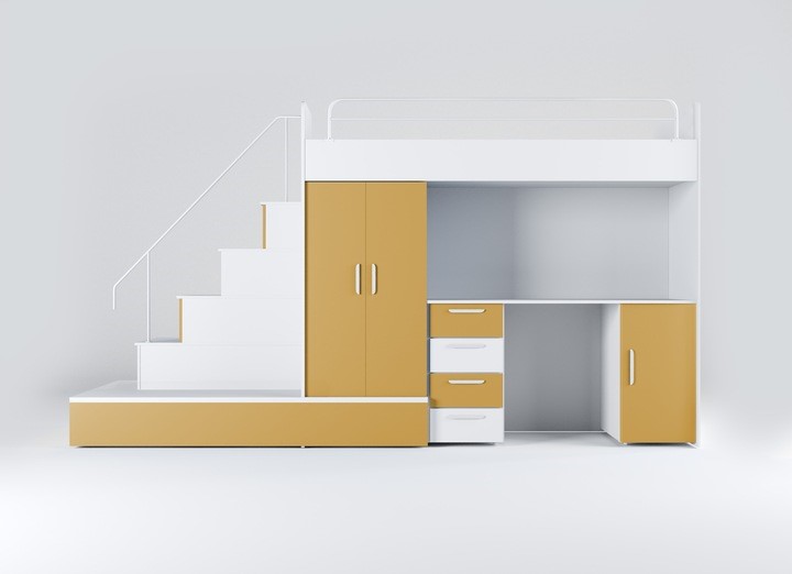 Postelja vključuje: mizo, garderobo, stopnice s predali, posteljni pod, vzmetnica za spodnjo dodatnje ležišče . Zgornja postelja je opremljena z zaščitno ograjo. Spodnja postelje se lahko uporabljajo kot praktični prostori za shranjevanje
