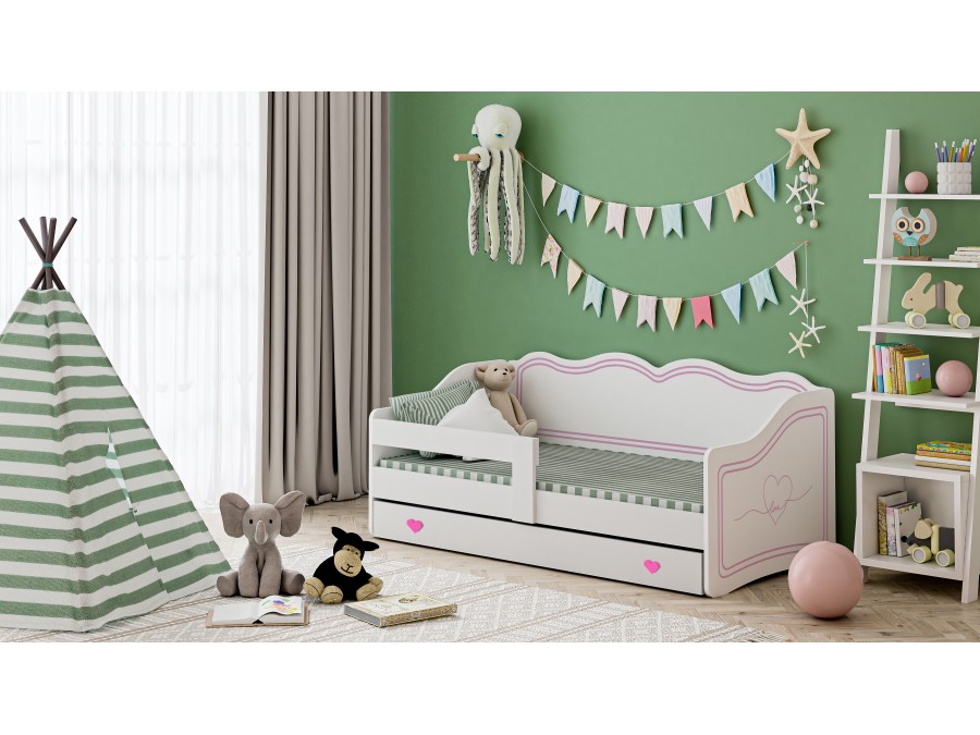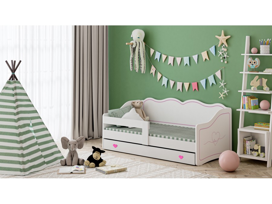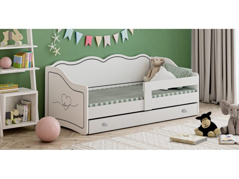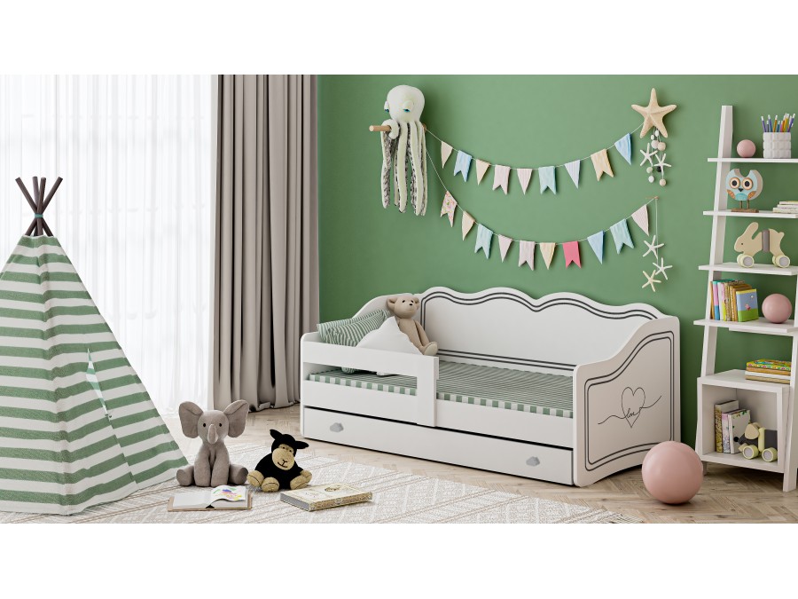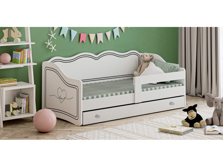 - Postelja je opremljena z odstranljivo varnostno ograjo, obdelano s posebno mehko gumo, ki otroka ščiti pred udarci.